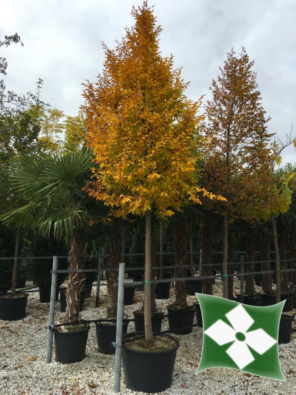 caduques. Elle présente des feuilles simples et alternes, de couleur verte foncée en haut et plus claire en bas. Elles sont ovales, pétiolées avec un bord doublement denté, à nervure pennée. La surface des feuilles est glabre. Le feuillage se colore en jaune en automne. |